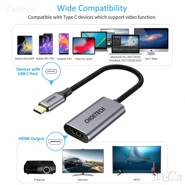 Адаптерът поддържа видеоразделителна способност до 3840 x 2160 (4K) @ 60 Hz и обратно съвместим със 720, 1080p. Лесно разширете или огледайте вашия USB-C лаптоп до HDMI-съвместими телевизори, дисплеи, проектори или монитори с HDMI кабел (не е включен), за да осигурите висококачествено видео изображение на свързания екран.