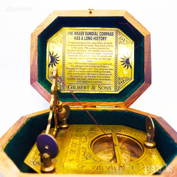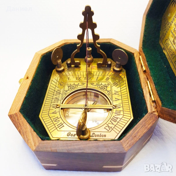 Открийте изключителния компас със слънчев часовник, изработен от масивен бронз и представен в елегантна дървена кутия с размери 14,5 х 12 см. Този уникален артикул съчетава функционалност и стилен дизайн, превръщайки се както в полезен инструмент за навигация, така и в впечатляващ декоративен елемент за дома или офиса.