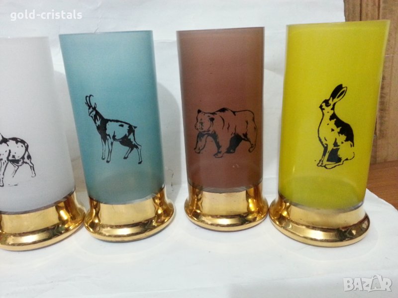 6 бр 94€-продадени 5 бр-78€ Стари стъклени чаши с ловни мотиви с форма на патрон цветни и позлата за вода без забележки сервиз комплект сет лот ретро арт декор винтидж колекция старинни антикварни предмети обзавеждане за дома и семейството подходящи за подарък за ценители и колекционери