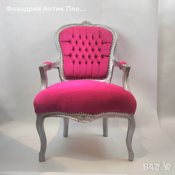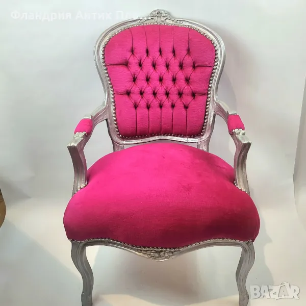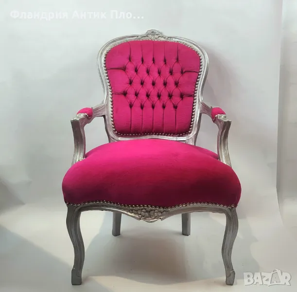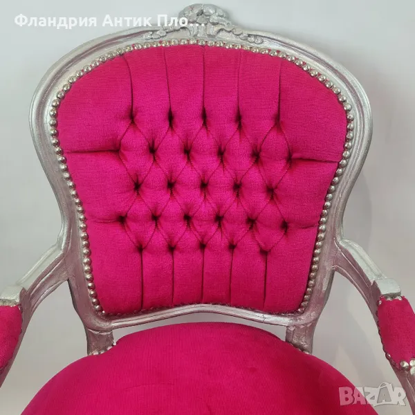 За изработката на това кресло е използвано масивно дърво, облечено в сребърен варак и дамаска от плюш, в цвят циклама.