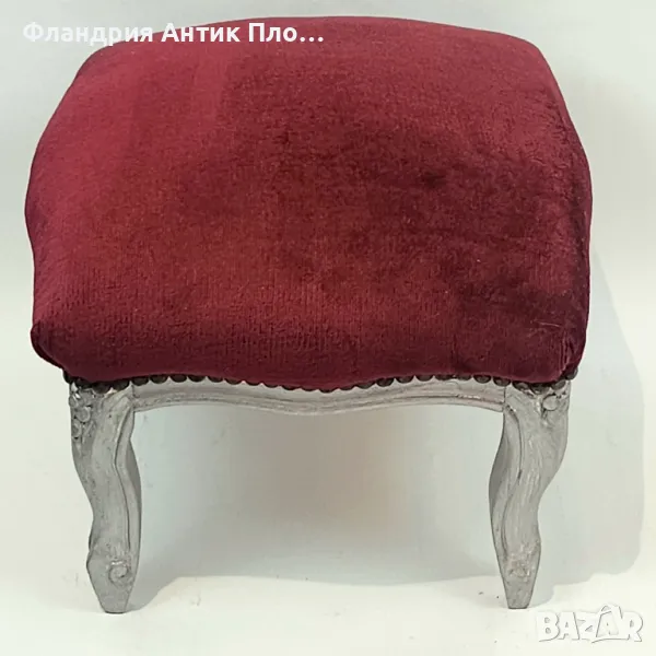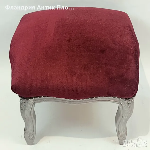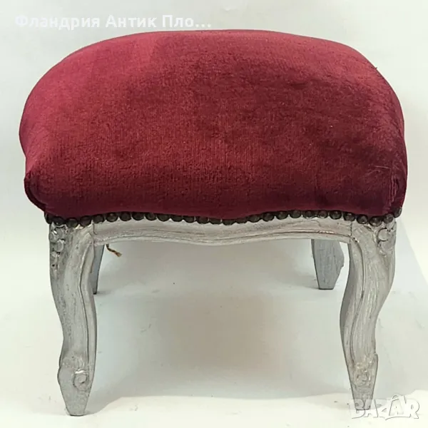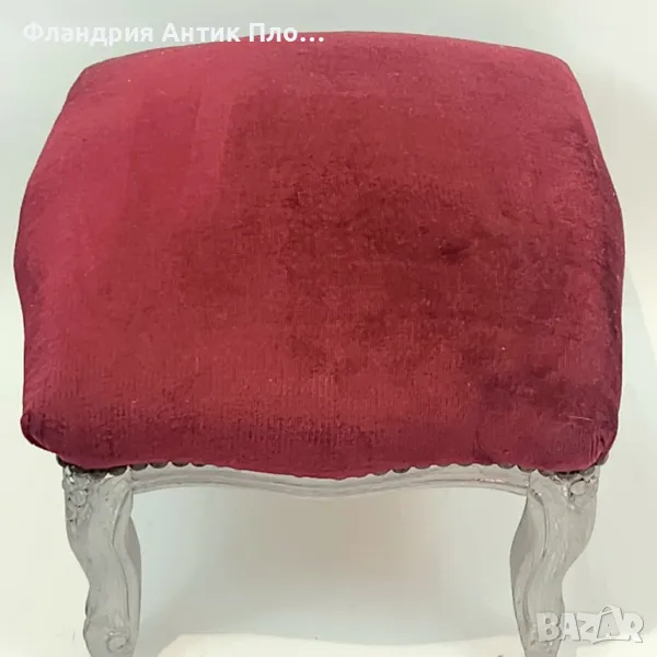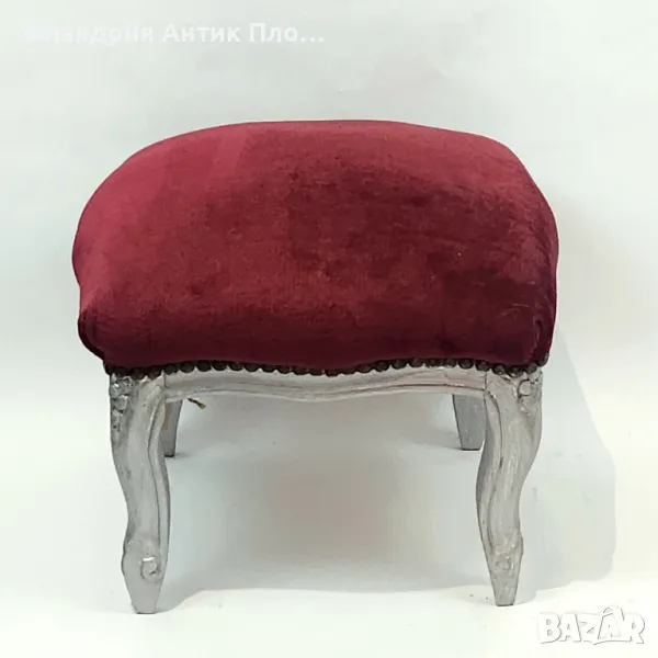 Изработка от масивно дърво, оцветено в сребърен цвят за конструкцията и тапицерия от плюш, цвят бордо за седалката.