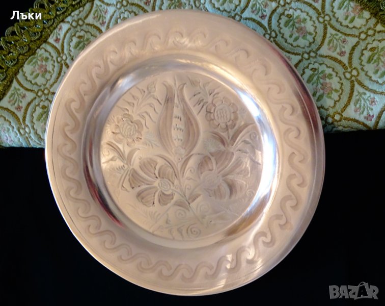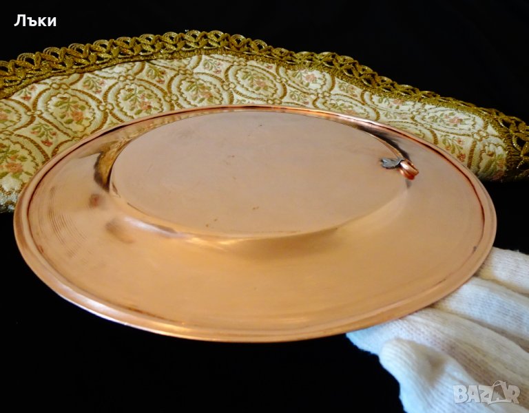 мед,нежно декорирана с релефно гравирани цветя и орнаменти.Има окачалка за стена.Височина 1.5 см.,диаметър 19.5 см.,тегло 160 гр.