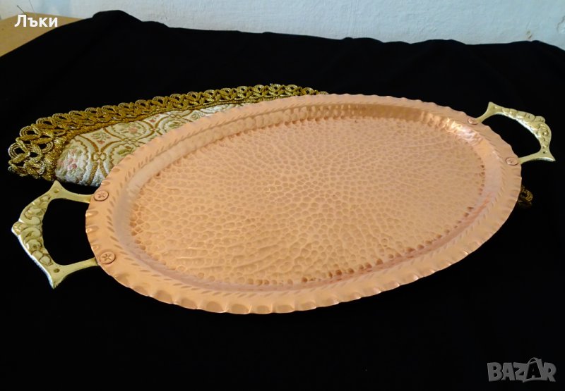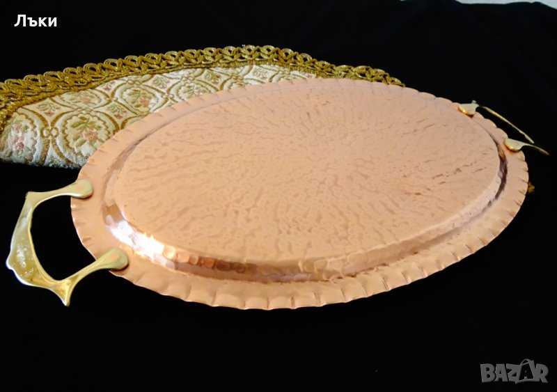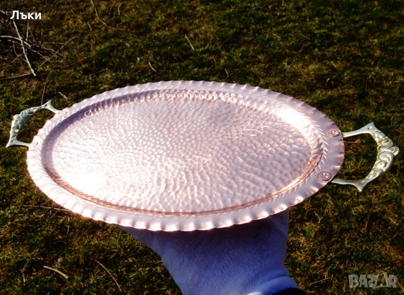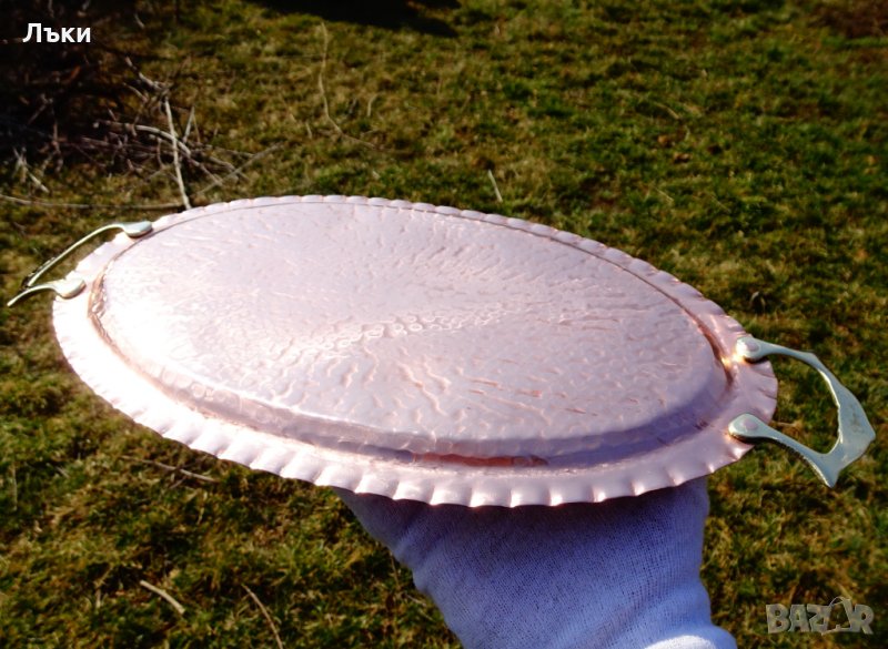 червена мед с красив релеф и две масивни релефно отляти бронзови дръжки.Дължина 36 см.,ширина 18.5 см.,размер на дъното 26 х 15.5 см.Тегло 320 гр.