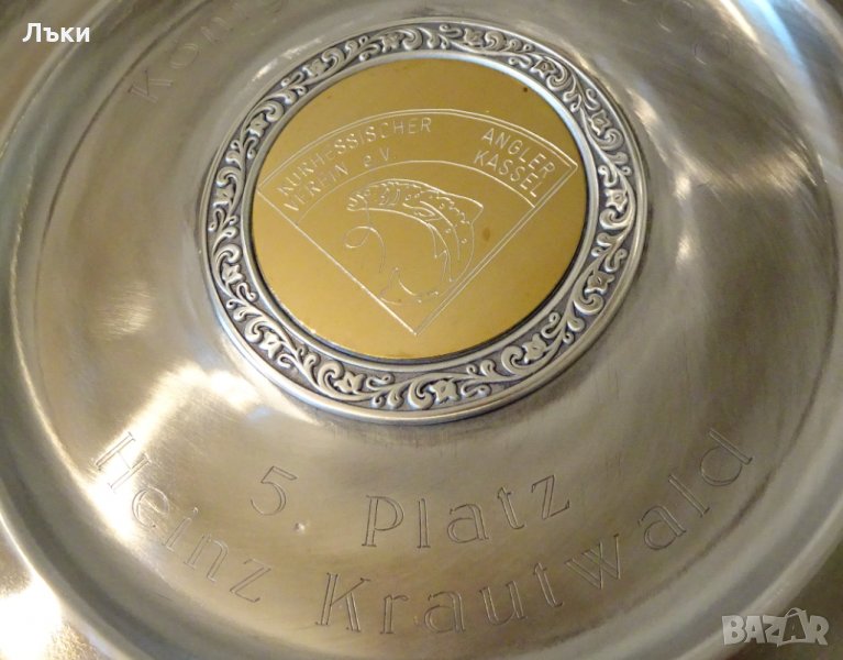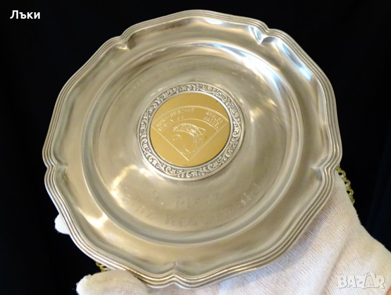 изработка от 95% калай и 5% сребро,маркирана със запазен етикет.Чинията е