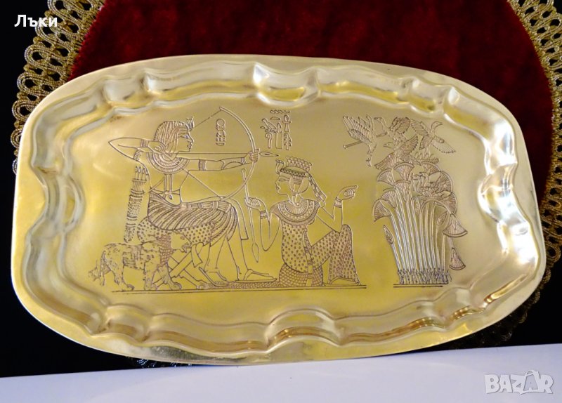 египетски символи – скарабей,йероглифи.По края подноса е декориран с красив релеф.Има стабилна окачалка за стена.Дължина 28 см.,ширина 17.5 см.,височина 2