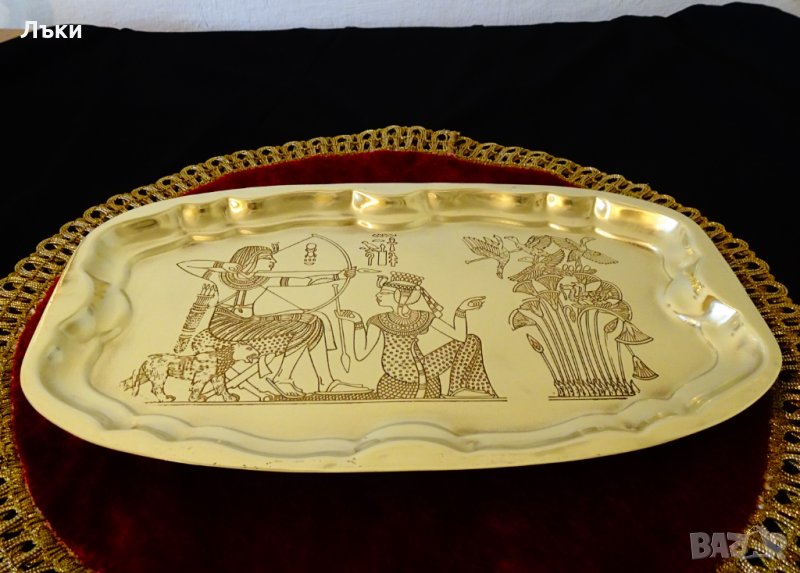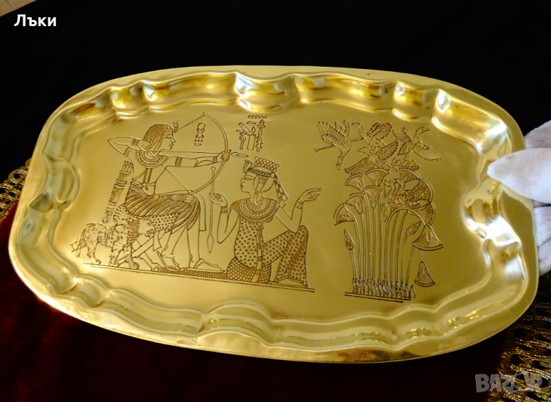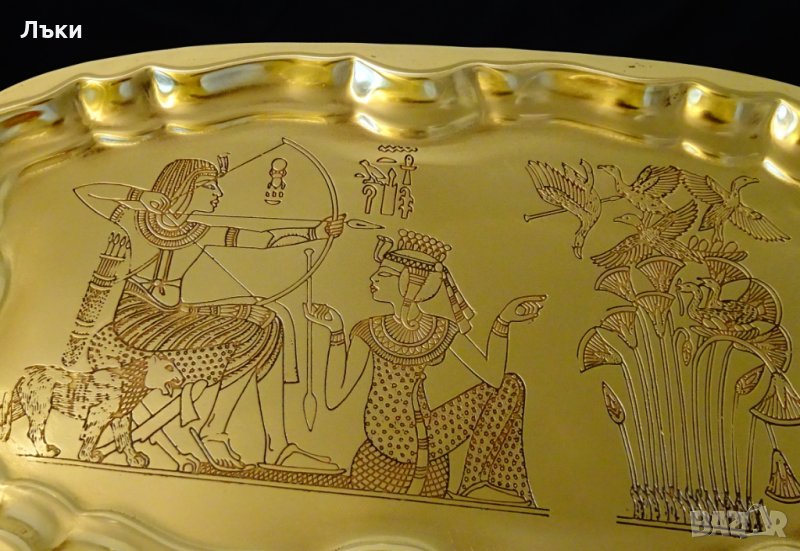 ръчна изработка от високо качествен месинг със златен блясък.В центъра има гравирана ловна картина,ловна сцена: Фараон с лък и стрели на лов за патици,богиня Изида му подава копие и насочва ръката му.До него стои лъв има и различни