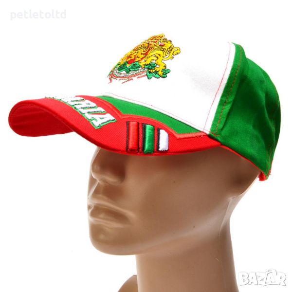 Шапка с козирка, декорирана с цветовете на българския трикольор и ГЕРБ на Република България и надпис BULGARIA