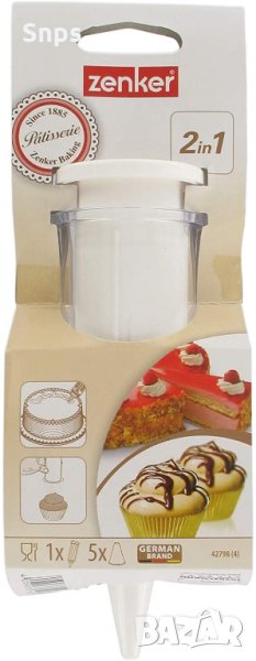 Спринцовка Zenker + 5 спринцовки 5 x 21,5 (брой: 6) Идеални за декориране на торти, пайове или тарти; оборудвани с два контейнера; различните дюзи ни позволяват да създаваме различни форми и декорации в нашите творения. Размери: спринцовка 5 х 21,5 см; Материал: полипропилен и полиетилен; ръчно пране. Когато купувате Zenker, можете да се доверите на фирма. Качество, традиция и иновация с добри идеи повече от век. Компанията разполага с широка гама от продукти с атрактивен дизайн с висококачествени незалепващи покрития като тефлон, илаг или емайл, осигуряващи най-доброто за всеки стил на печене. Всички продукти на Zenker са подложени на строги тестове за качество, за да се гарантира качество и правилно функциониране.