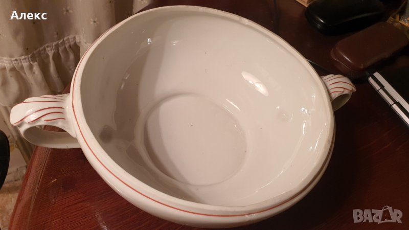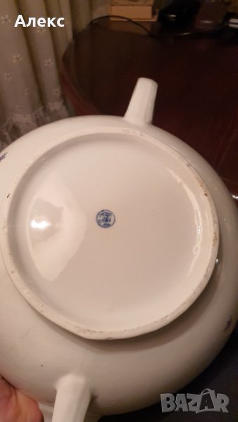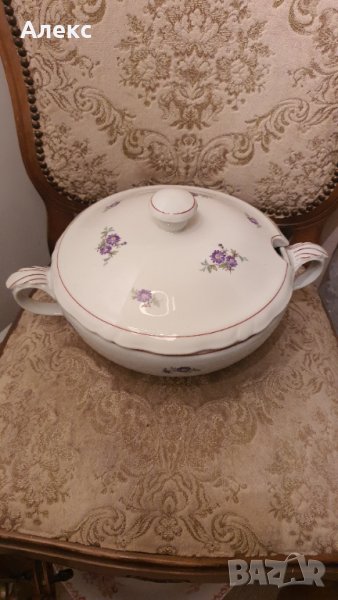 Има чипче, отбелязано на две снимки! При затворен капак не се забелязва. Други забележки няма! Като нов, отличен гланц и кантове. Много нежни лилави цветенца, червен кант.Стойко Иванов Пеев Моделът на този супник е произвеждан от началото на 50-те до началото на 60-те години. Ширина: 33см Височина: 18см