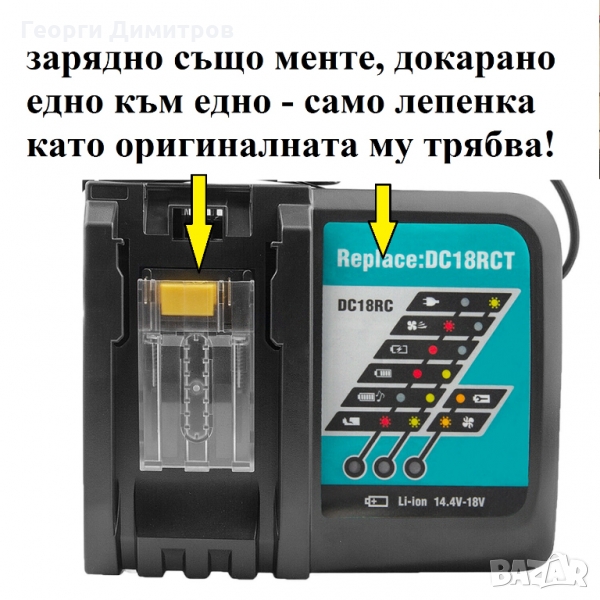 Когато купувате такова зарядно винаги си носете батерия и го тествайте - сложете батерията и изчакайте поне две минути да видите дали зарядното няма да отхвърли батерията и да не иска да я зареди - появяват се две мигащи светлини червено и зелено, или мигаща червена светлина че батерията е топла ама тя не е, тези зарядни са ама много капризни и зареждат само читави батерии, ако я отхвърли извадете батерията и я сложете втори път, до пет пъти пробвайте - това го казвам от опит. Ако батерията Ви обаче не е читава не очаквайте зарядното да я зарежда, просто трябва да сте сигурни че батерията Ви е читава когато пробвате зарядно.