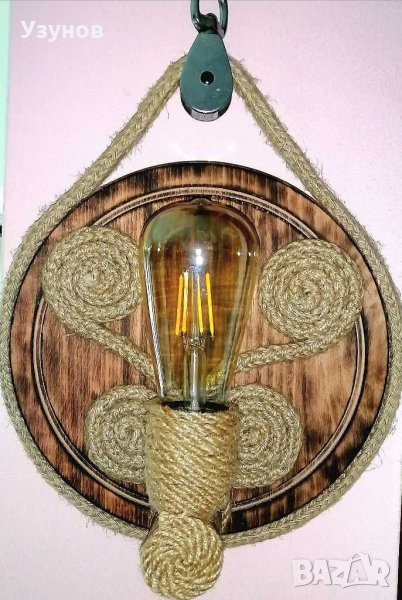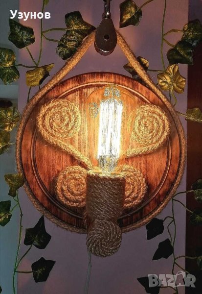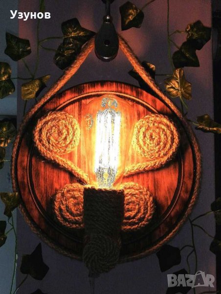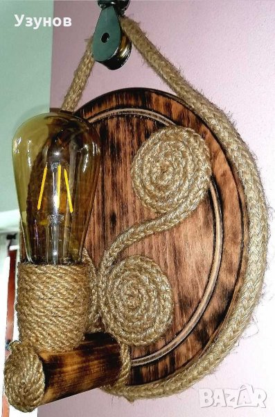 Продавам уникална, ръчно изработена, стенна дървена лампа (осветително тяло) от естествени материали - обгорено липово дърво и въжета от юта и коноп. Изключително подходяща за тераса, механа, и стая в битов или винтидж стил. Предназначена е за стенен монтаж. Лампата много добре допълва интериора на закрити градини, тераси и помещения обзаведени с дървени или ретро мебели и декор от естествени материали и в същото време осигурява много добро осветление. Един прекрасен подарък за Вашия битов кът. Предназначена е за работа с един брой филаментна ЛЕД лампа с мощнмост 4W, която излъчва светлина колкото обикновена 40-45W лампа. Лампата е с топла светлина, каквато излъчва обикновената лампа с нажежаема жичка и с каквато сме свикнали всички.Реално консумираната мощност за час на осветителното тяло е 4W, а светлината, която излъчва е като от 40W осветително тяло. Размерите на лампата са: 35 см. х 25 см. Посочената цена не включва филаментната крушка.