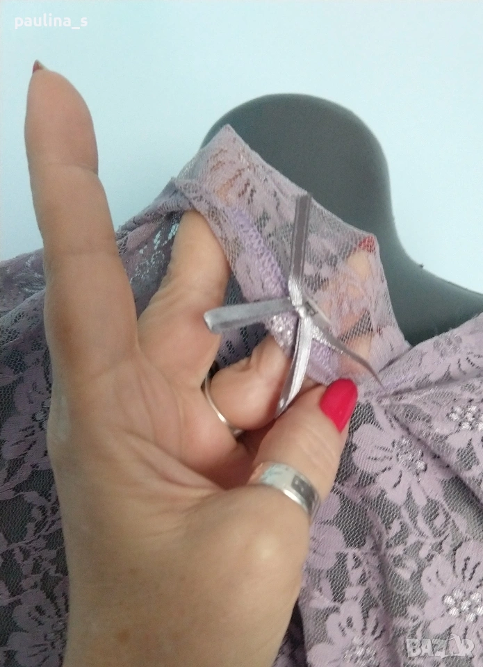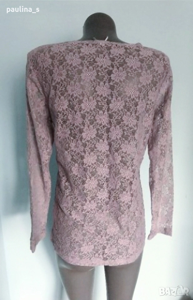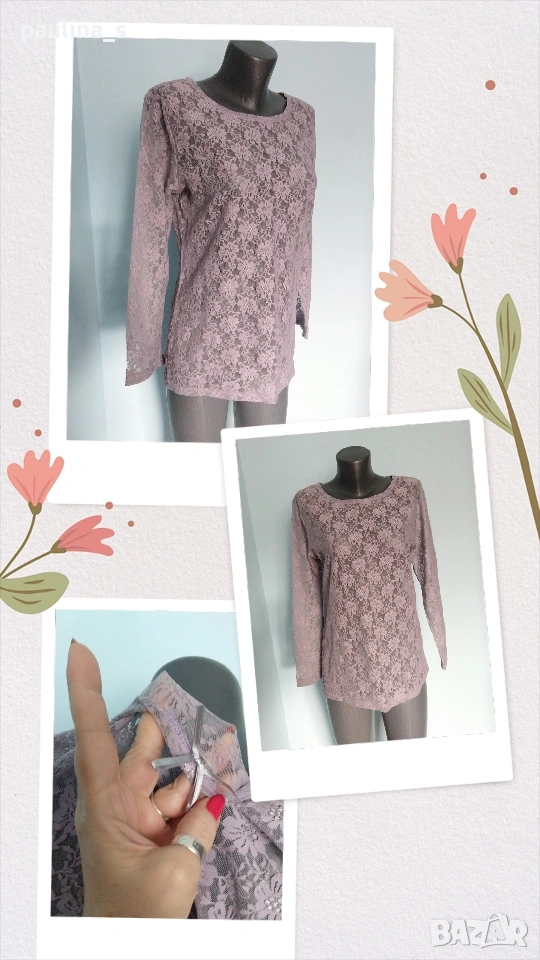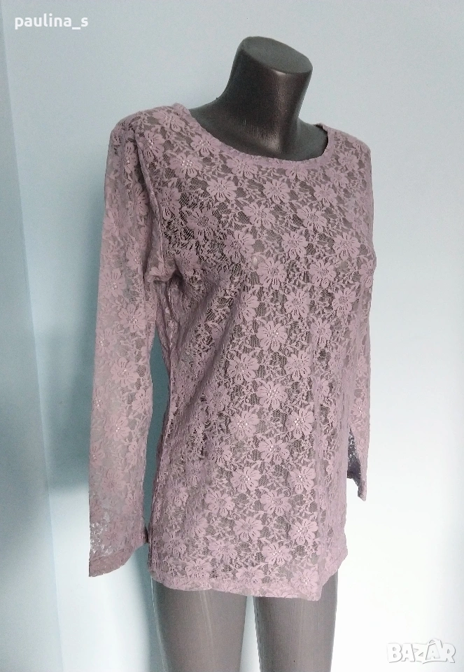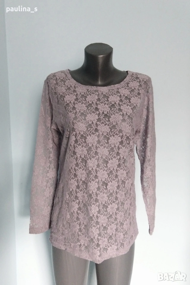 2️⃣. L / 2XL - "Ze-Ze". Цената е крайна, без пазарлъци 19 евро. Една бройка. Много красива блуза с дълъг ръкав от еластична дантела. Цветът е лилав, поради еластичността може да се носи от няколко размера, една бройка е. Като нова, без етикет.