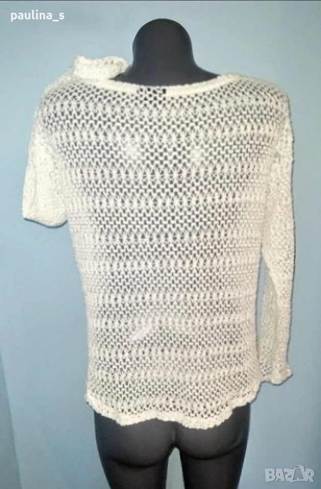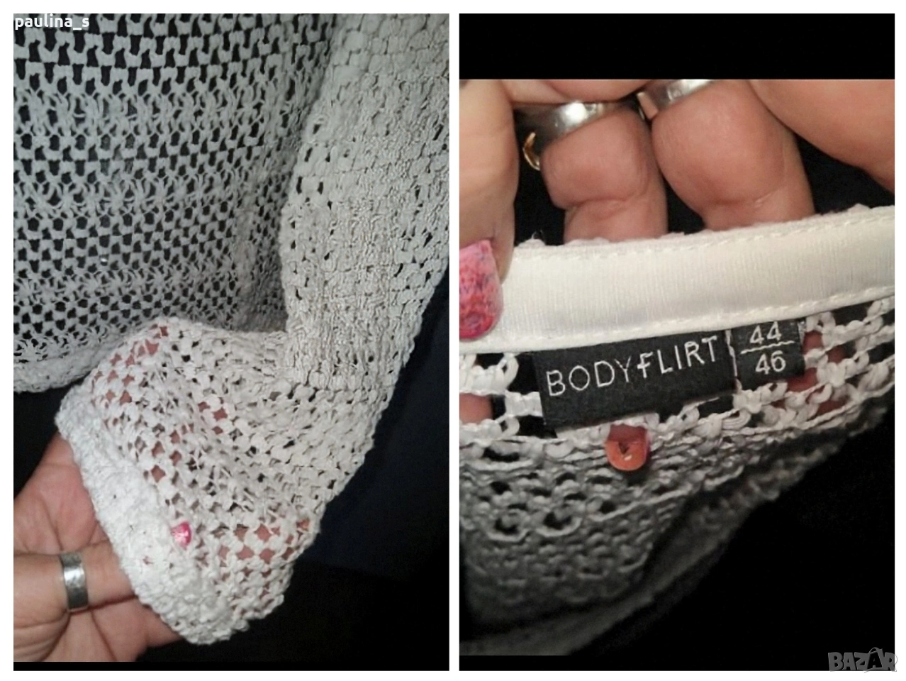 3️⃣ L / 2XL - "Bodyflirt". Цената е крайна, без пазарлъци 17 евро. Дизайнерска блуза тип туника от дантела. Моделът е кроп с издължаване отзад, ръкавите са с фабрично фиксирани подгъв, дължината е 7/8. Материята е памук с примеси има еластичност и може да се носи от няколко размера. Много красива дреха. Без дефекти, като нова е без етикет.