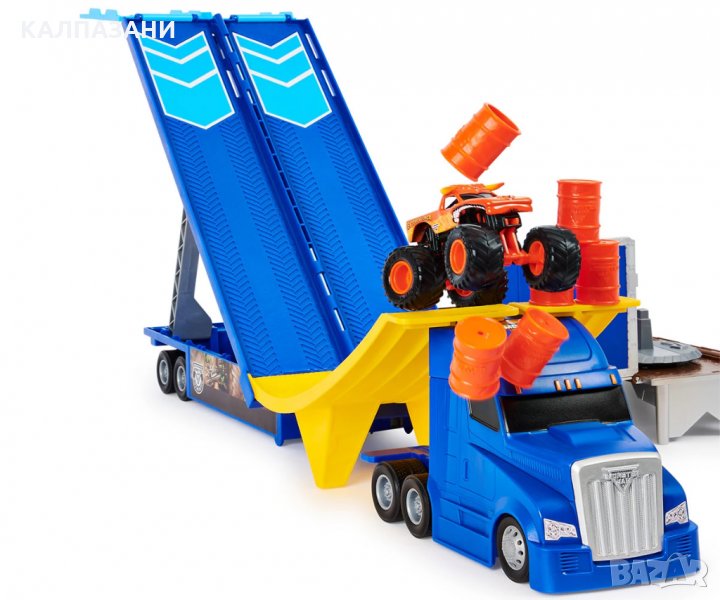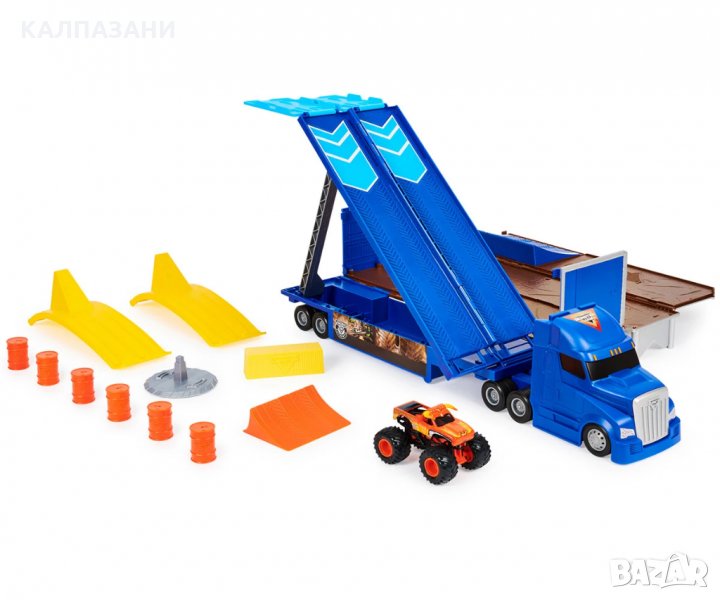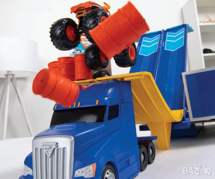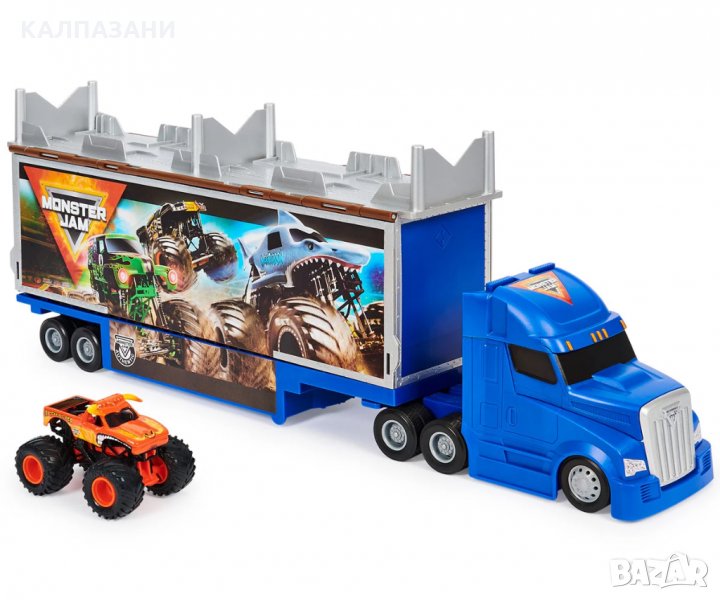 Този страхотен комплект за игра Monster Jam в мащаб 1:64 е точно като истинския камион, който носи превозни средства Monster Jam на всяко шоу.