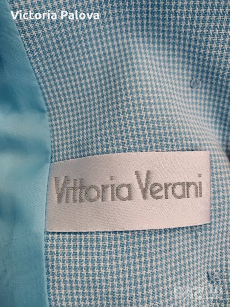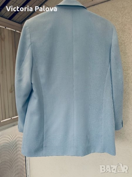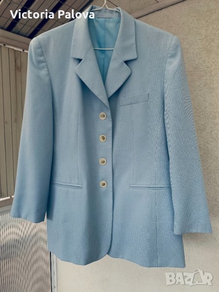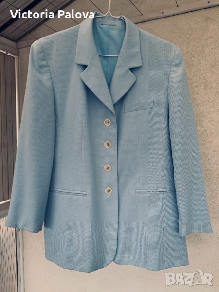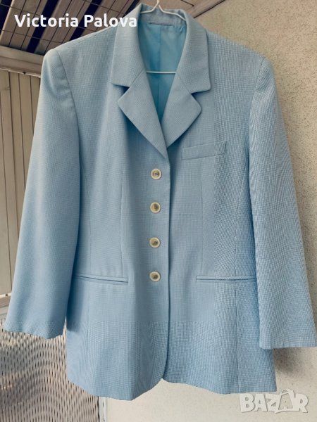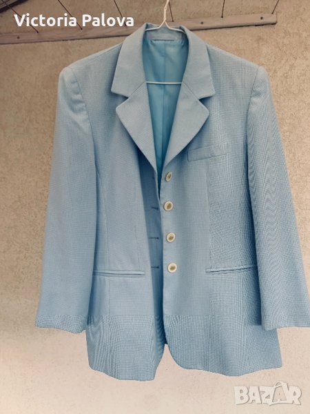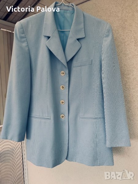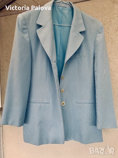 Необикновен красив цвят,неупотребявано сако,много удобно и комфортно,не се мачка.рамене-44см,ГО-54см,талия-48-49см,дължина-75-76см,ръкав от рамо-58см,от мишница-36см.