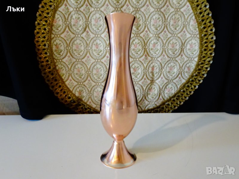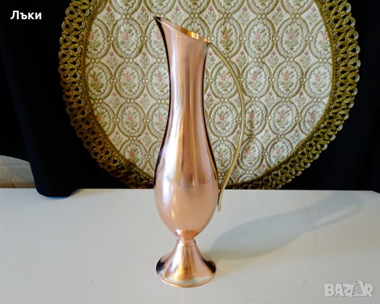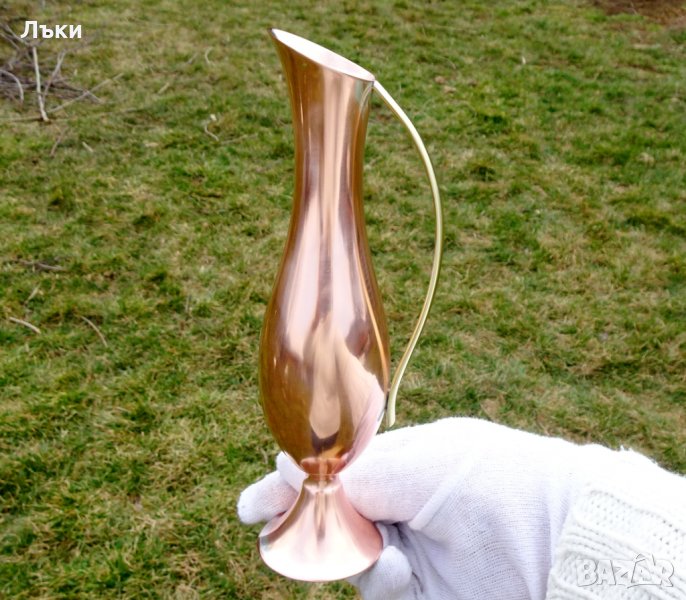 Немска кана за ракия,ваза,изработена от високо качествена чиста червена мед с дръжка от бронз.Има класически елегантен дизайн.От вътре не е калайдисана,идеална за ползване.Височина 20 см.,диаметър 6 см.,тегло 160 гр.От вътре не е калайдисана има следи от посребряване.Вместимост 200 мл.