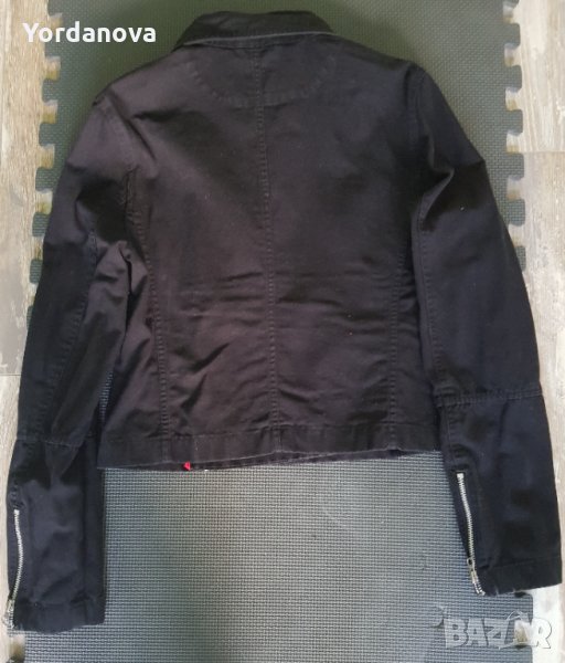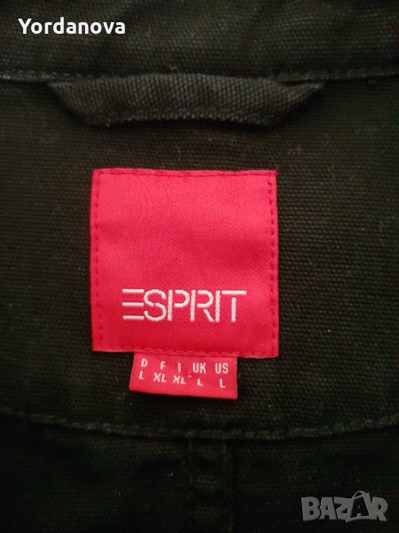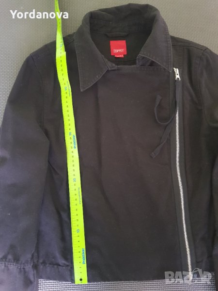 Оригинално дамско черно яке на марката ESPRIT. Носено е няколко пъти. Купувано е от Англия. Отговаря на английски размер L. По-подробно за размерите може да се ориентирате на снимките. Плътна и здрава материя. Закопчаване - с цип. С ципове и на ръкавите. Машинно пране.
