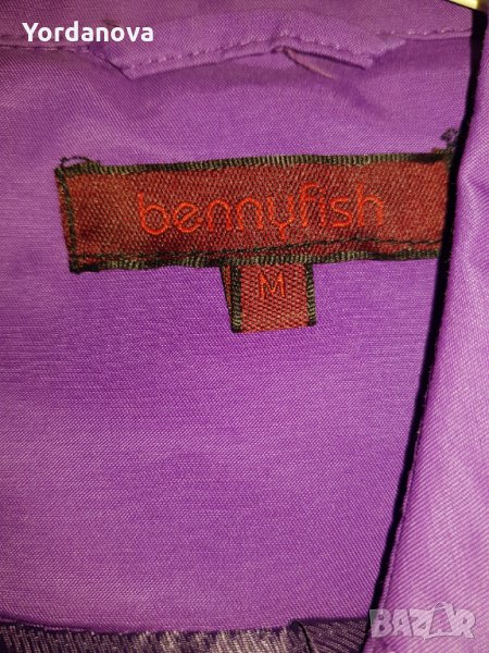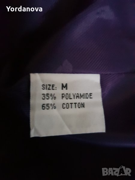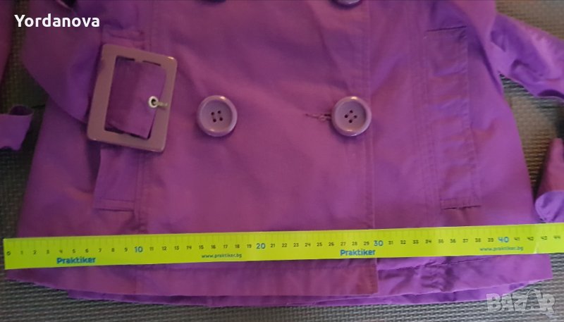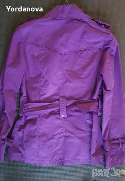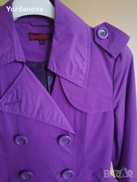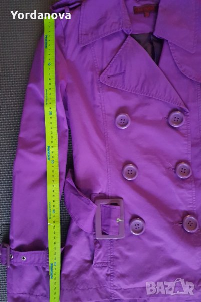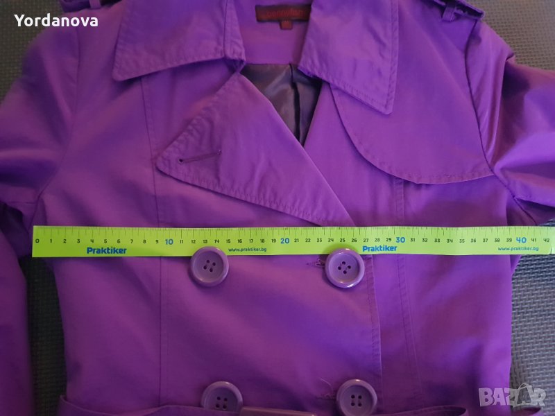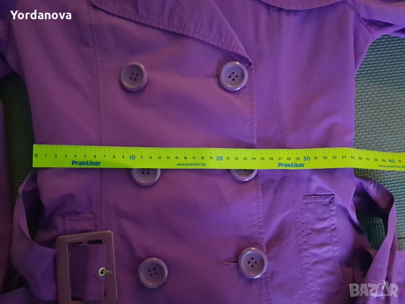 Дамско палто, носено няколко пъти. Размер М. За по-подробни размери може да се ориентирате по снимките. Материя - лека и тънка, 65% памук и 35% еластан. Цвят - лилав. Закопчаване - с големи двуредови копчета и колан.