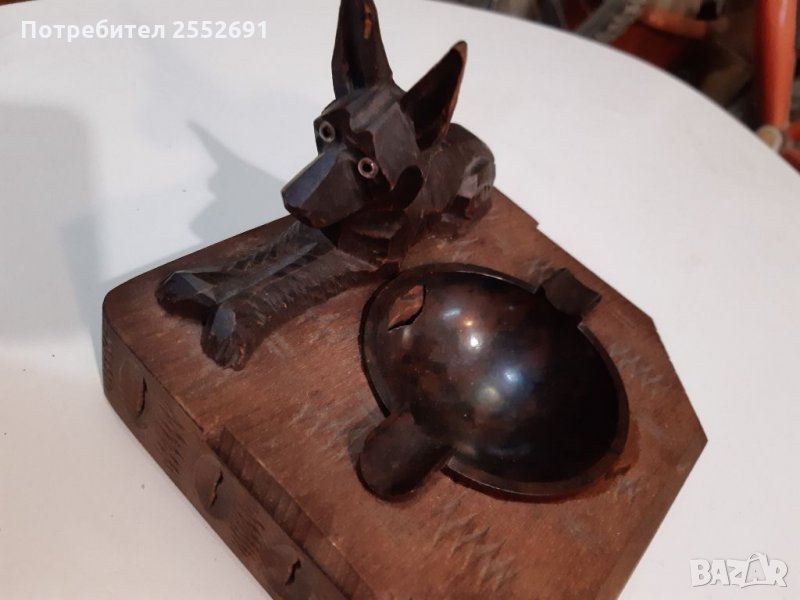 Ръчно изработен и резбован пепелник с фигура на куче . Размери на основата- 14/13/3,5см. Размери на фигурата-12/7,5/3см.