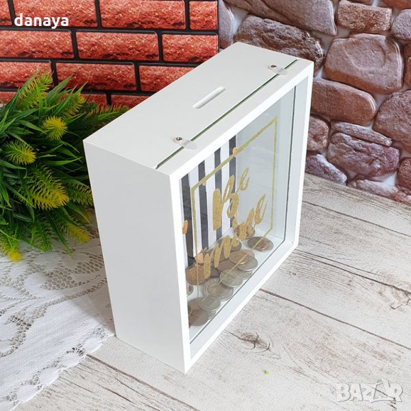 Голяма дървена касичка със стъклено прозорче и надпис “Be mine”. Събира много стотинки. Прозорчето се надига, за да се извадят спестените пари.