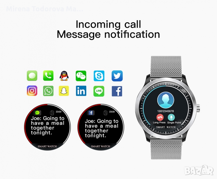 Интелигентно напомняне: Чрез свързване на смарт часовник със смарт телефон вашата информация може да се показва на смарт часовник едновременно, като входящи обаждания, текстови съобщения, поща и др.