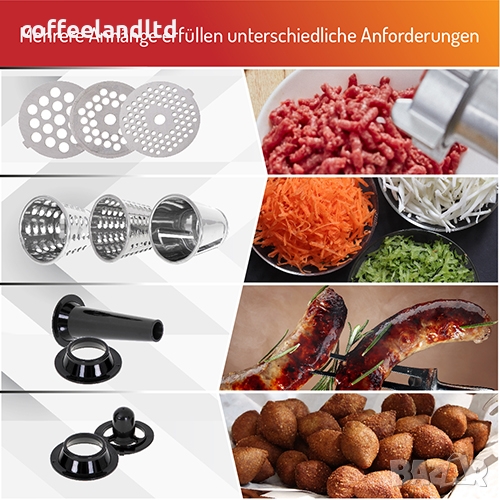 сами колбаси и кайма. Месомелачката е оборудвана с 3 сменяеми приставки от