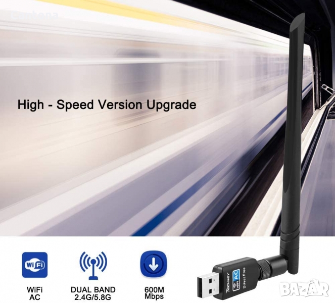Мрежови адаптер Techkey AC600, 600 Mbps, Wireless-AC, USB, 5dBi