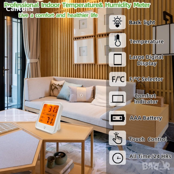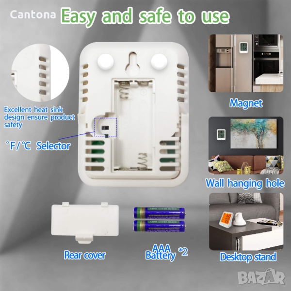 Интелигентен дизайн: Опции за монтаж: настолна стойка, окачване на стена и магнитен гръб.Отличният радиатор гарантира безопасността на продукта.Селектор за °F/°C;захранва се от 2 батерии AAA (включени).