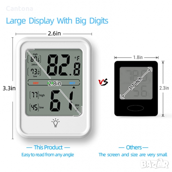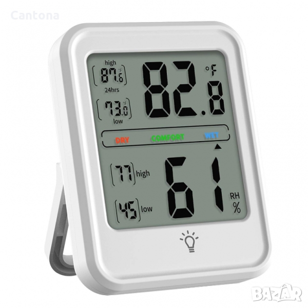 Вътрешният термометър разполага с 2,8-инчов LCD дисплей с големи цифри, което ви позволява да четете цифровото от разстояние;Включете подсветката, тя продължава 8-10 секунди, след което автоматично се изключва.