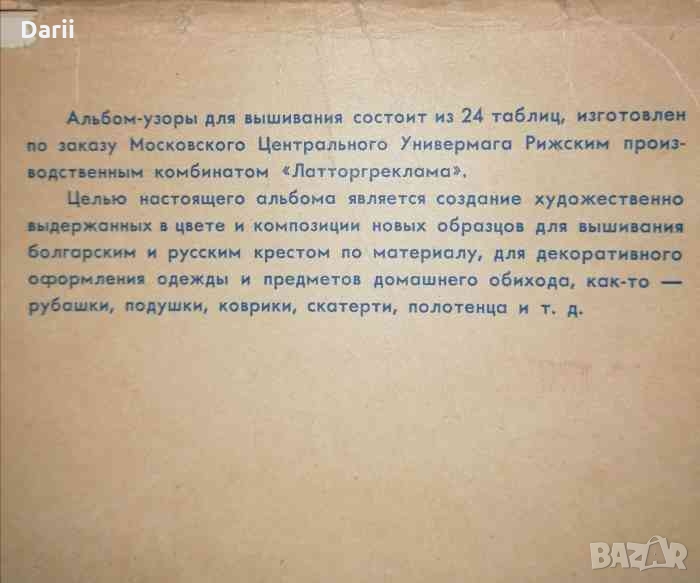 Целью настоящего альбома является создание художественно выдержанных в цвете и композиции новых образцов для вышивания болгарским и русским крестом по материалу, для декоративного оформления одежды и предметов домашнего обихода, как-то - рубашки, подушки, коврики, скатерти, полотенца и т.д.