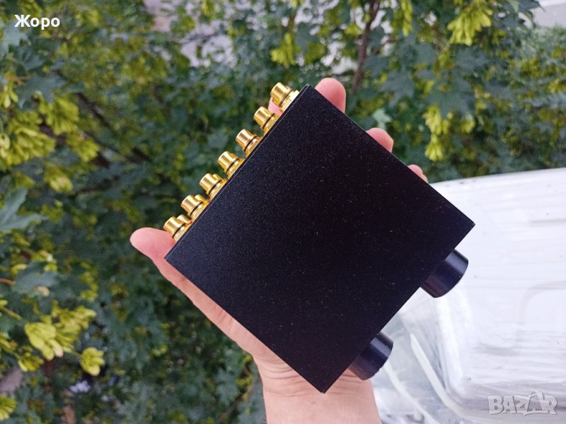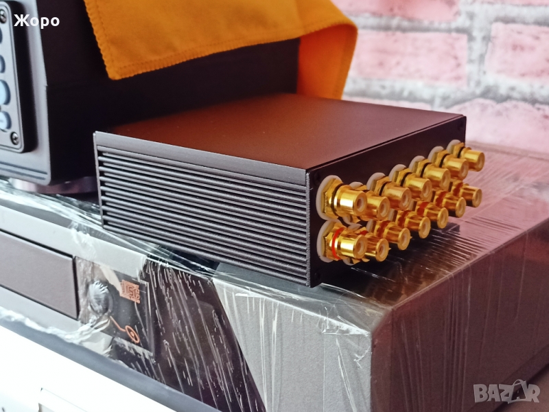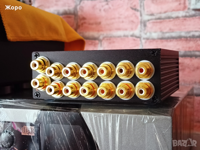 6 стерео входа, 6 позиционен. Ръчна изработка, лята кутия, ляти копчета, Monacor медни позлатени чинчове, окабеляване Sumitomo посребрена безкислородна мед 26AWG 80°C, превключвател RFT с медни контакти, нискошумящ стерео потенциометър Excell, 9 броя феритни филтри, качествени силиконови крачета. Чисто нов. Цената е 380 лева твърда. Ако не сте чували подобно нещо, ще останете много изненадани как свири. Опционално може да се постави аудиогрейд японски потенциометър ALPS 20k, цената е +35 лева.