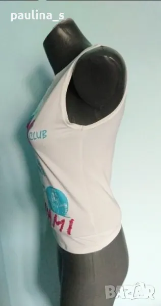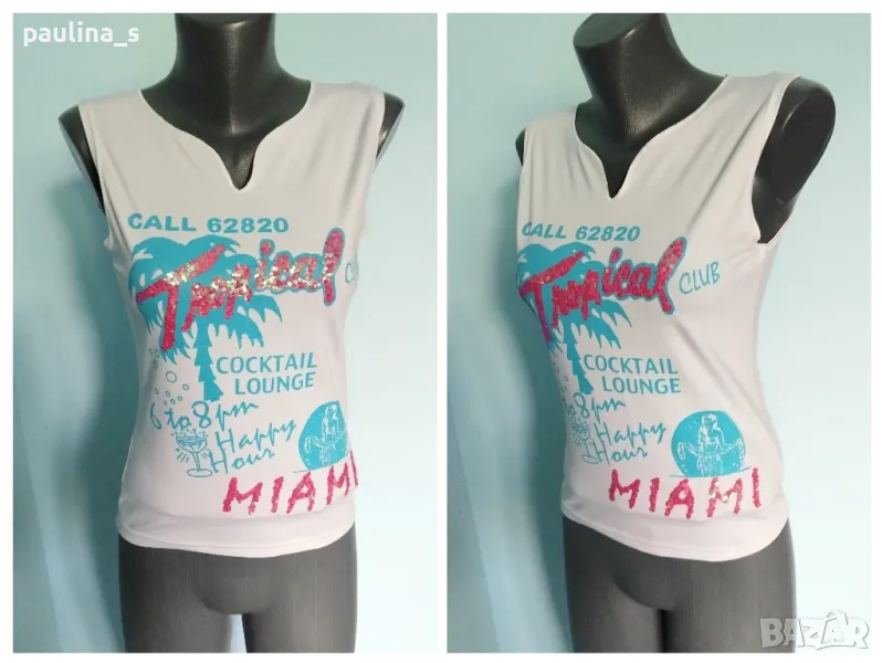 3️⃣. Колаж / Бяла блуза / бюстие с щампа. Цената е крайна 17,99лв / 9 евро. Много симпатична и много еластична декорирана блуза с интересно деколте, пайети и щампи, носеща лято в себе си. Материята е мека и еластична ликра и покрива няколко размера. Една бройка, без дефекти, като нова.