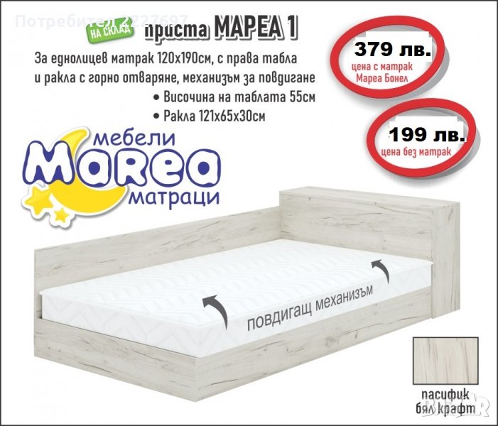 Изработена от ПДЧ за матрак 120/190 с механизъм за повдигане. Цена с матрак 379лв. Шкаф Мареа 2 с отделна цена 149 лв. Предлага се в следните цветове: пасифик бял крафт, дъб сонома и табако крафт . Бърза доставка!