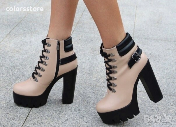 , снимка 1 - Дамски боти - 36056013 Боти на ток - бежова кожа с черно ходило - BT14