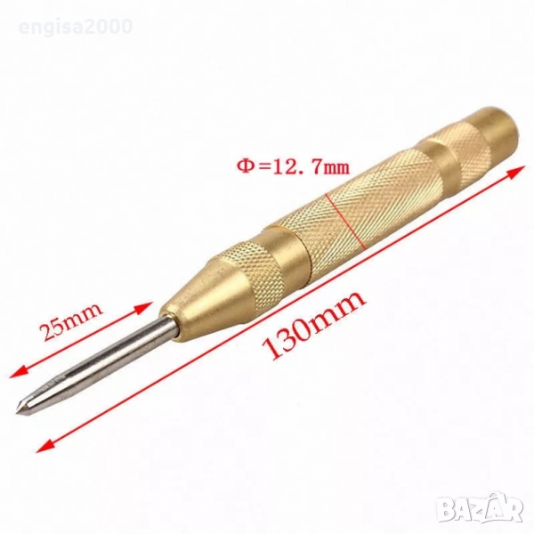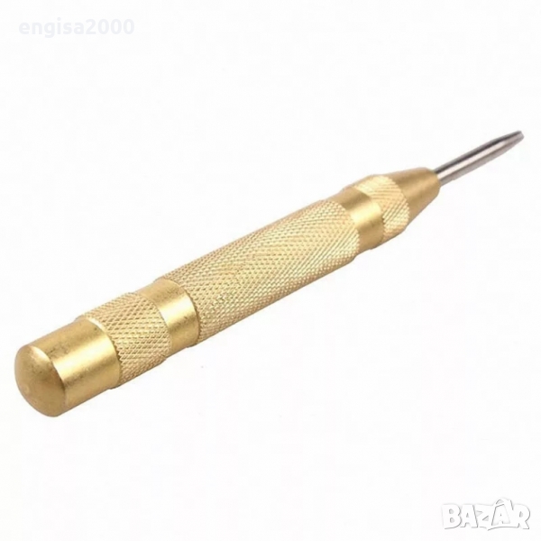 Автоматичен център за центриране на свредла. Изработен е от метал и е с пружинен механизъм. Натиска се с ръка и остава дълбока следа в метала.