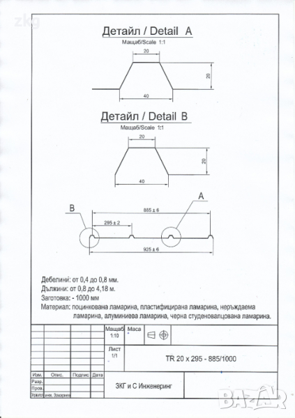 ламарина с профил TR20x295-888 предназначена за покриви на малки халета, селскостопански постройки, гаражи,