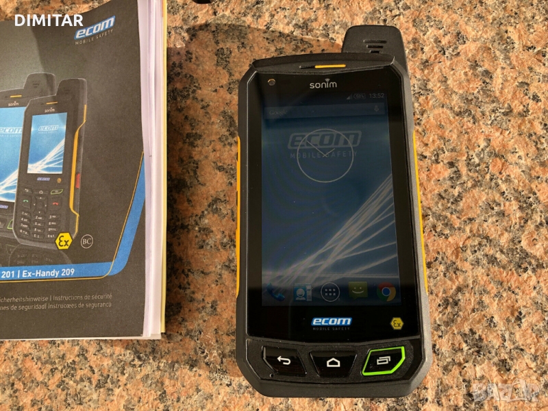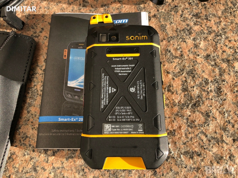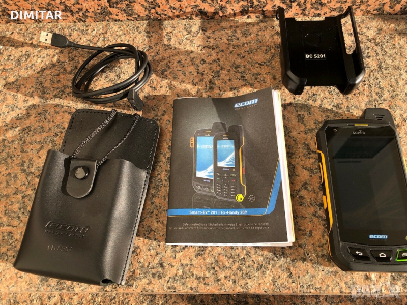 Ecom Smart-Ex 201 Atex одобрение. С инструкции за експлоатация, USB магнитен кабел за зареждане, оригинален кожен калъф ECOM и държач (щипка за колан).