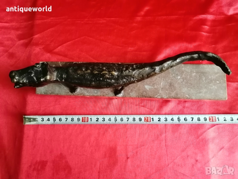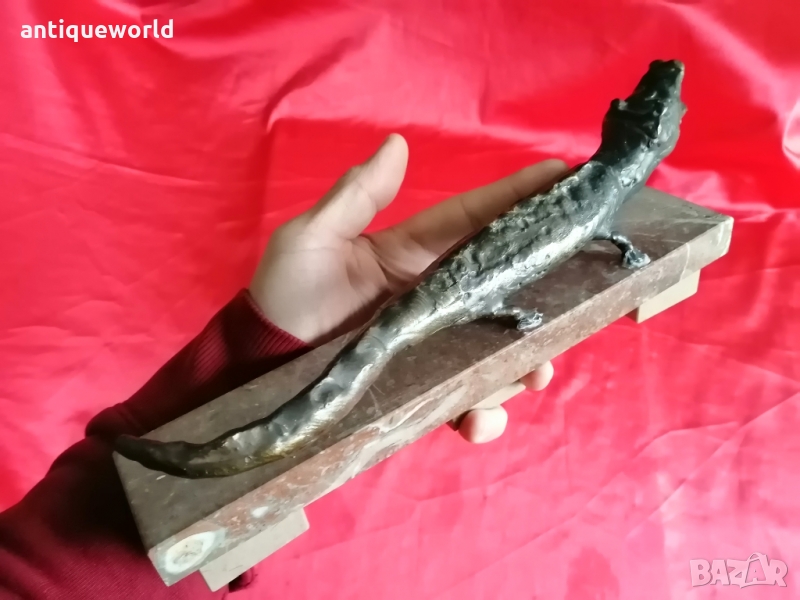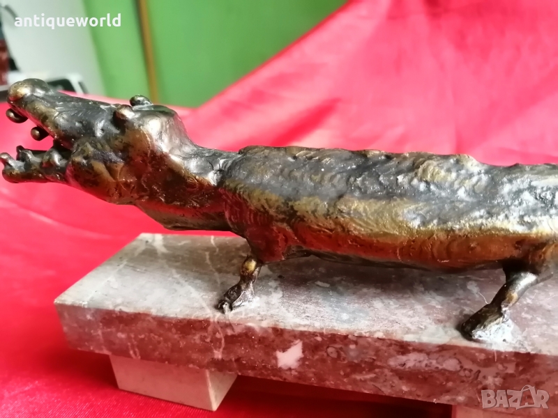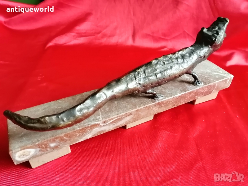 Уникална Авторска Бронзова Пластика КРОКОДИЛ . Тегло 2кг! Бронзова статуетка, пластика върху постамент от Розов Мрамор.Неподписана.Състоянието е видно.
