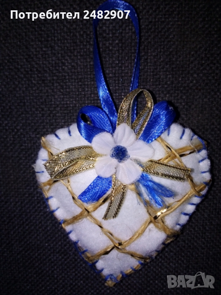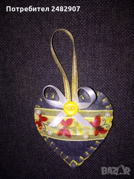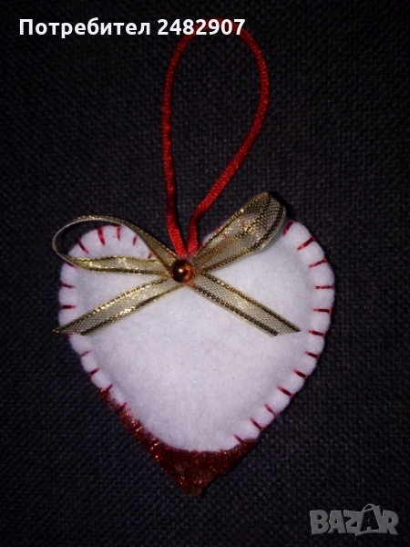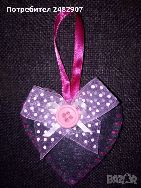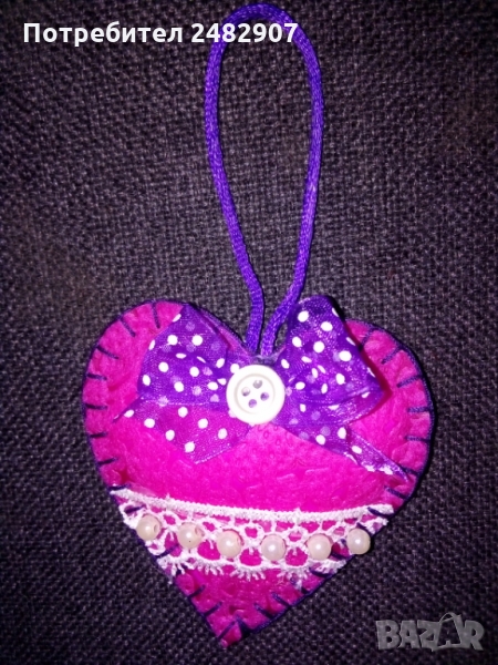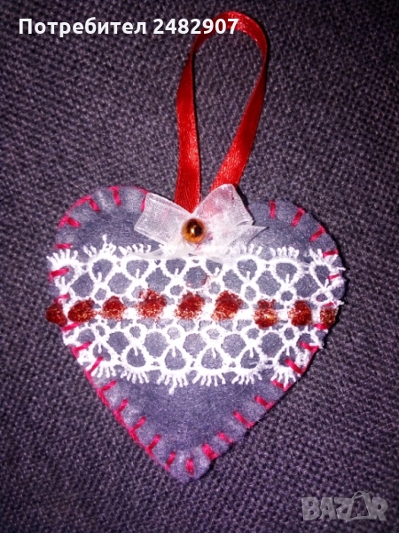 Сърца за декорация/подарък - ръчна изработка, различни по модел и вид. Използвани материали - филц, дантела, силикон, мъниста, панделки, лепило, силиконов пух/памучна вата. Размери - приблизително 7/7 см. Същите се предлагат и на клечка. Цена за 1 бр. - 6,50 лв.