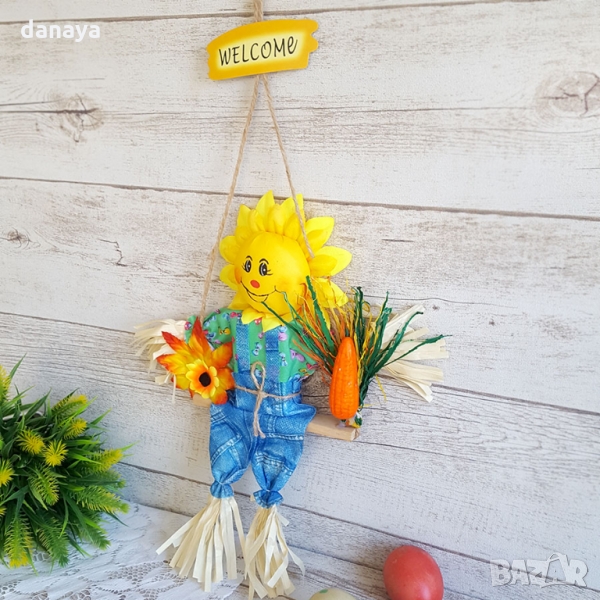 Слънчева украса за закачане на стена или врата, за да украси светлият празник Великден. Слънце седнало на люлка, украсено с цветя, морковче и надпис Welcome. Ще стои чудесно на входната врата. Прекрасна декорация за Великден. Фигурата е изработена от текстилни и естествени материали.