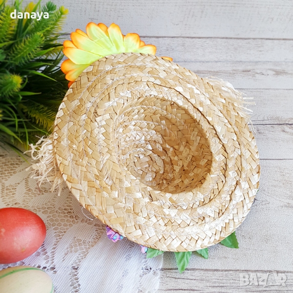Великденска декорация, украса за стена или врата. Весело слънце с тяло от сламена шапка, която е декорирана с пеперуди и цветя. Ще стои чудесно, където и да го закачиш. Прекрасна декорация за Великден. Фигурата е изработена от текстилни и естествени материали.