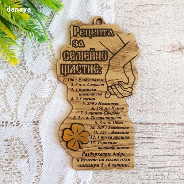 Дървена плочка с надпис, особено подходящ за подарък за сватба, за новосъздадено семейство, за годишнина от съвместен живот и изобщо подарък за обичащи се. Плочката е декорирана с четирилистна детелинка, символ на късмет. Върху този сувенир е изписана закачлива рецепта за семейно щастие.