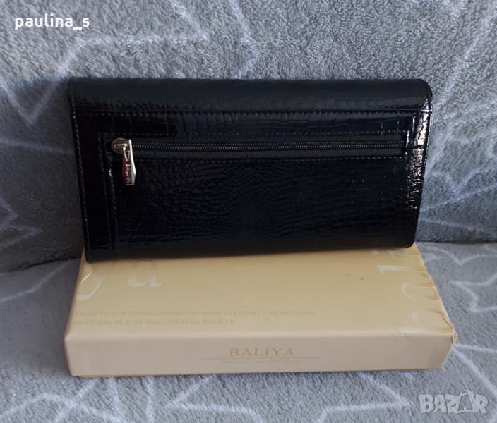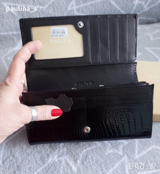 портфейл от естествен лак с нормално закопчаване. Има монетници, органайзъри и множество прегради. Размери 17см / 10см