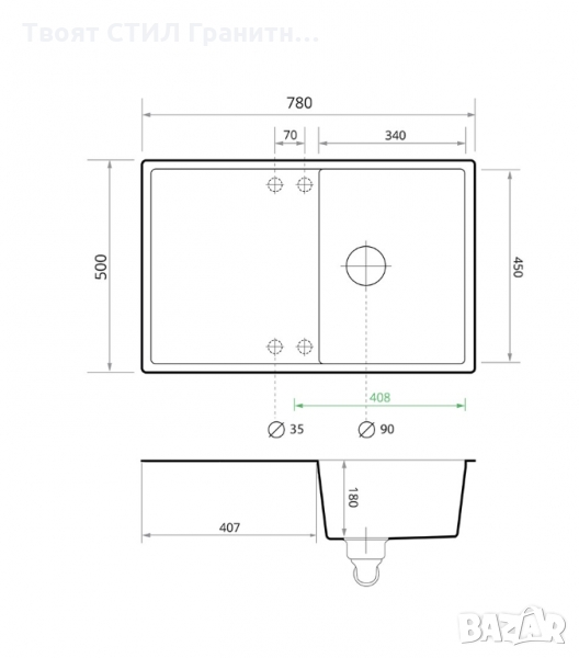 Размери: 780 x 500 mm, дълбочина на коритото: 180 mm