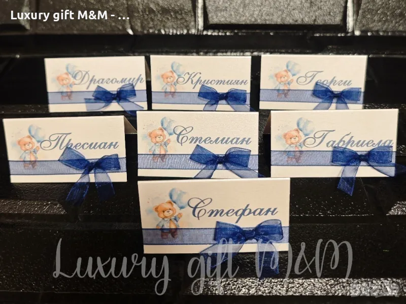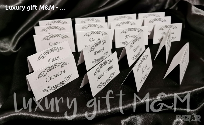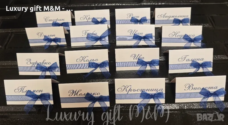 Табелки за имена - изработени от перлен картон с размери 8х4,5