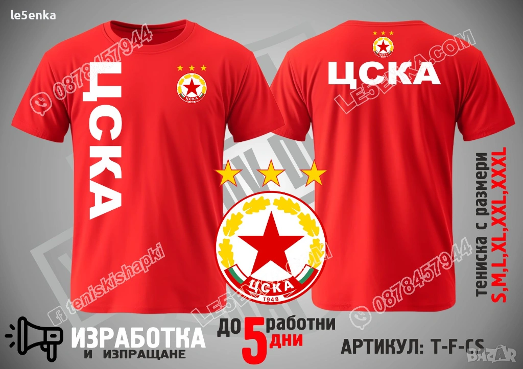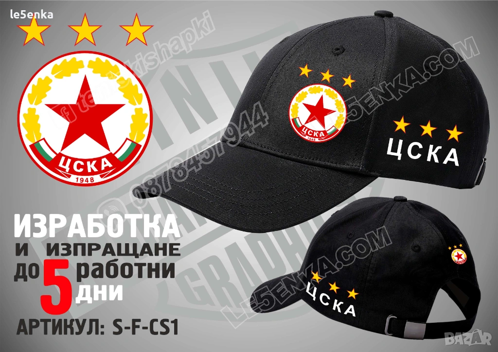 Посочената цена е за шапка и тениска. Само шапка - 18 лв. ,а само тениска - 32 лв. Тениските са изработени от качествена памучна материя - различна номерация и цветове. Шапките са памучни с метален клипс или коланче за регулиране - тип бейсболни. Последната снимка в обявата е на таблица с размери за тениските.