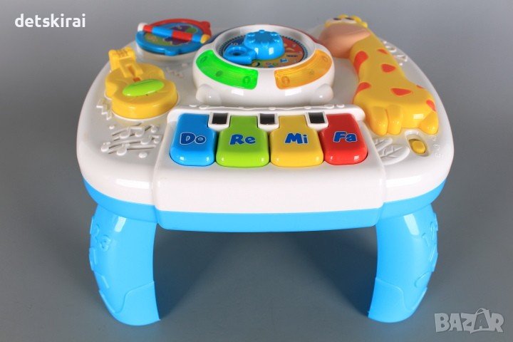 Функции: весели мелодийки, забавни звуци, книжка за прелистване с реалистични звуци на кученце, слонче и пиленце, свирене по ноти, светещи елементи, бутон за регулиране силата на звука, бутон ON/OFF.