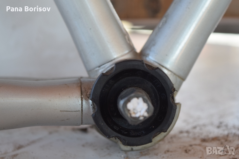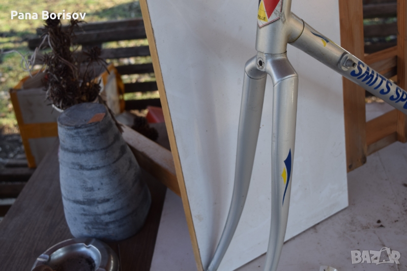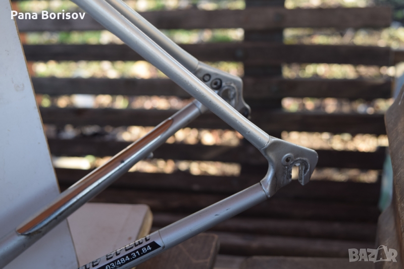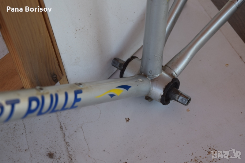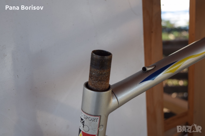 Фреймсета се намира в много хубаво състояние, боята се вижда от снимките че е много запазена. Рамката е с размери 52см. вертикална и 54см. хоризонтална тръба. Рамката е производство може би от края на 80те. Към рамката е включено средно движение Ofmega което се върти перфектно. Рамката ще има нужда от чашки тип английски стандарт, колче за седалка 25мм., като задното разтояние между ушите е 130мм.