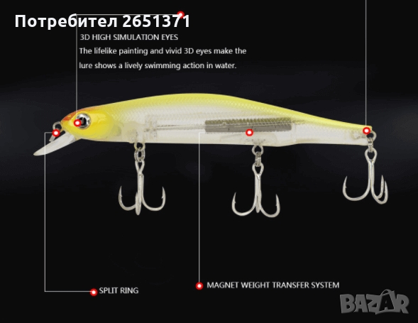 Воблерът е Suspending, т.е. при спиране на движението той застива във водата и нито потъва, нито плува.