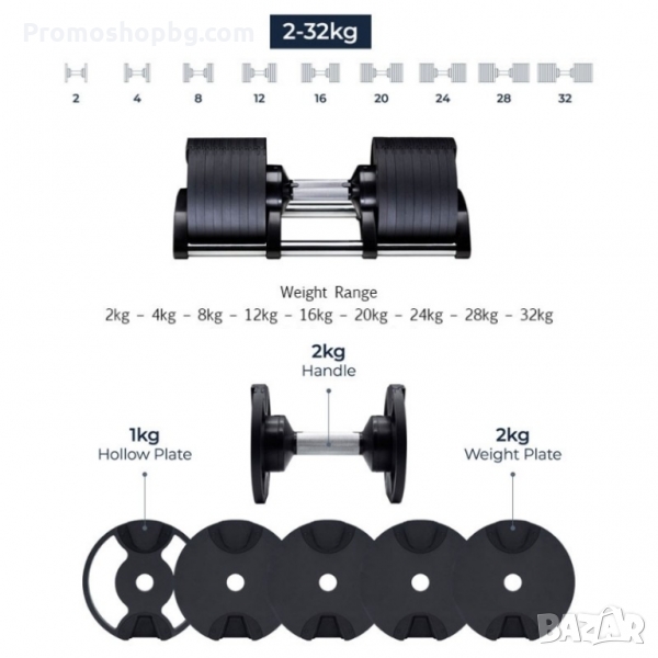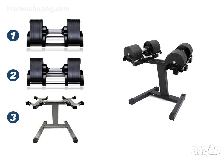 Комплекта включва 2 бр. регулируеми дъмбела до 32 кг. и стойка.